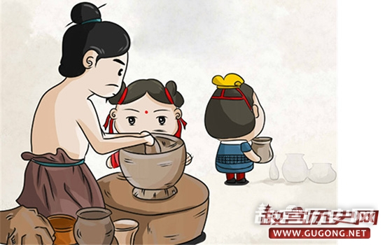 他的第三件作品还是一个陶盆,但这件陶盆却使他由一个陶匠又成了一个巧妙、高超的画家,因为他在这陶盆上面画上了刚刚见到的少女们翩翩起舞的景象。然后他又做了几个小口尖底的瓶子,瓶子的下半部还有两只圆孔,可以用来系绳。然后就让人们把他做的这几个陶器放进窑中去烧。