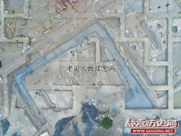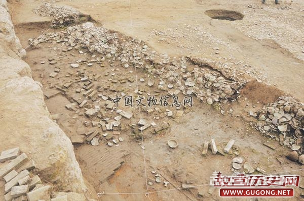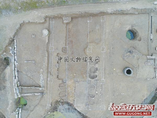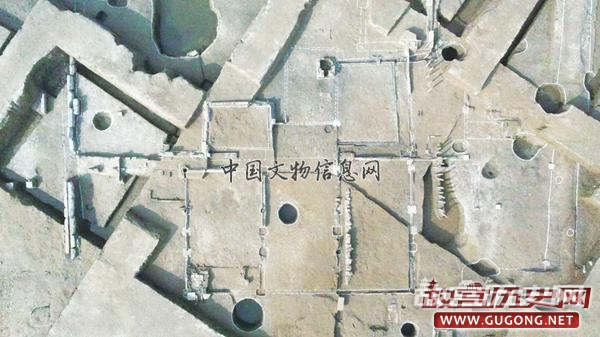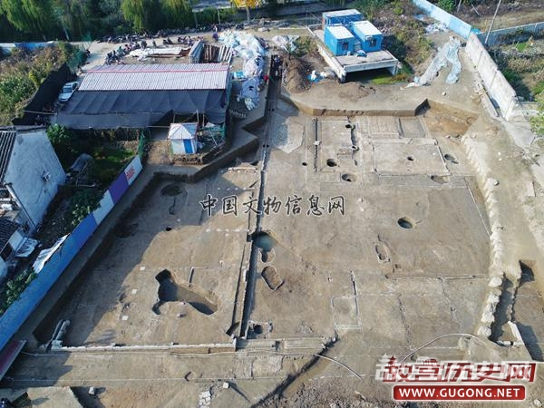 大型院落:位于东发掘区中东部。其北部因现代施工破坏,东部一部分被现代建设破坏,一部分叠压于现代居民楼房之下,未能揭露。根据发掘情况来看,其外围墙现存长约49.2米,残宽约26米,墙体最宽约0.7米。推测门向西北方,方向约320°。