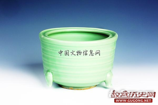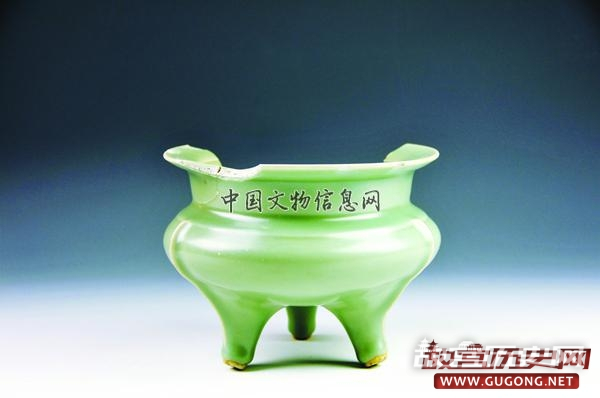青釉鬲式炉:残,元龙泉窑产,出土于西发掘区灰沟(G17)内。口径17.0厘米,高13.0厘米。直口微敛,外折斜沿,圆唇,短束颈,扁鼓腹,下腹附三锥形足,平底;肩部有一周凸棱,腹部与三足相对处有三道明显的三角形凸棱,从肩部延伸至足部。灰白胎,通体施青釉,足端无釉。