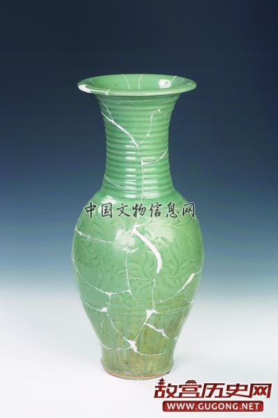 青釉刻花牡丹纹瓶:残,修复完整,元龙泉窑产,出土于东发掘区仓储遗存区域。口径17.2厘米,底径10.2厘米,高43.5厘米。喇叭形口,沿外翻,束长颈,溜肩,弧腹,下腹内收,圈足外撇。颈部阴刻弦纹,肩腹部阴刻缠枝牡丹纹,下腹部阴刻莲瓣纹。灰白胎,胎体厚重,通体内外施青釉,足端无釉。此器高大厚重,在韩国新安沉船出水有同类型器物。