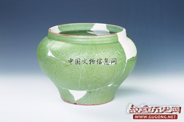青釉刻花缠枝牡丹纹荷叶盖罐:残,修复完整,元龙泉窑产,出土于西发掘区河道(HD3)内。口径27.3厘米,底径18.9厘米,高26.4厘米。失盖,直口,圆唇,溜肩,鼓腹,下腹内收,圈足,内底残缺。肩部刻划仰莲纹,外壁中部刻划缠枝牡丹纹,下部刻划莲瓣纹。灰白胎,胎体厚重,通体内外施青釉,口唇、足端无釉。此器敦实厚重,在韩国新安沉船出水有同类型器物。