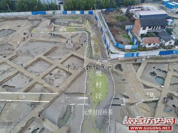 古樊村泾与驳岸、古桥、古道路:古樊村泾位于遗址中北部,湮没于现代地表之下。根据遗址发掘需要,对其北段与致和塘连接区域清理揭露,发掘长度约100米。