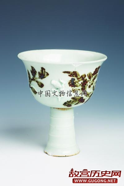 点褐彩堆塑螭龙纹转柄高足杯:残裂,拼接完整,元景德镇窑产,出土于西发掘区河道(HD3)内。口径8.3厘米,底径3.4厘米,高9.4厘米。侈口,沿外撇,尖唇,深弧腹,竹节形高柄足,中空,足端外撇,呈喇叭状,柄足可旋转。外壁绘褐彩缠枝花卉纹,堆塑螭龙纹,柄足阴刻四道弦纹。白胎,胎体较薄,通体施青白釉,足端及其底心无釉。该器形现存较少,弥足珍贵。