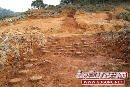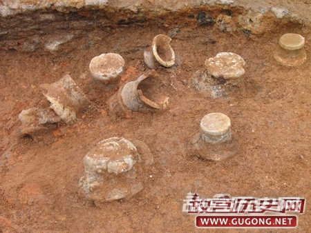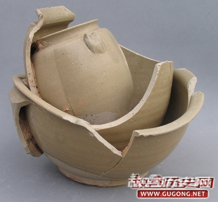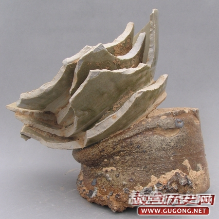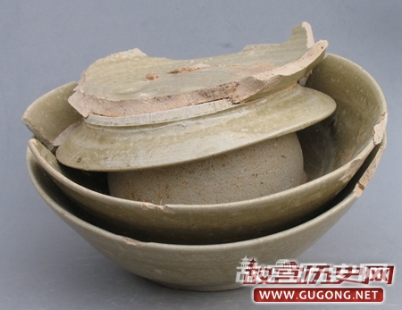 明火叠烧直接置于喇叭形垫具上,用泥点间隔,一般是同类器物叠烧,如各种碗,也有不同器物叠烧的。出土一组烧结的器物中,最上面是一件小罐,外面套一件较大的罐,罐外面是一件盆形器,盆形器外面烧结一件折敛口的钵,总共至少四种器物套叠在一起。