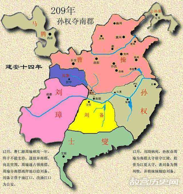 当然了,“蛇无头不行”,周瑜这一死,吴军的西征只得作罢。而且这对刘备来说又是一个不可多得的良机。因此刘备不失时机地再次提出了领有江陵的要求,而接替周瑜上台的鲁肃也极力赞同。孙权终于兑现了当初的诺言,“分荆州与刘备”,代领南郡的程普也“还领江夏”(《程普传》),代领周瑜兵众的鲁肃也离开江陵,“下屯陆口”。至此,刘备经过不懈的努力,终于讨回了江陵。(大汗,原来“站着借债,跪着讨债”打从三国起就有了的)