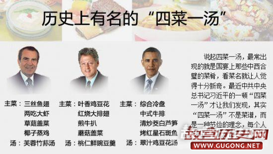 上世纪60年代,我国对国宴的规格有过一系列批示:“现在的宴会规格太高,吃掉的还没有扔掉的多,白白浪费了国家的物资。千篇一律都上燕窝鱼翅,花钱多,而且又不实惠。有些东西外国人根本就不吃。我们请外国人,我看有‘四菜一汤’就可以了。”