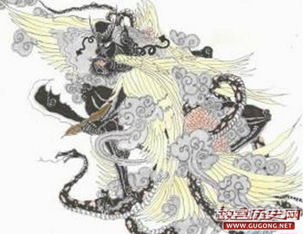 黄帝封少昊为西方金德之帝,少昊告别他的百鸟,留下人面鸟身的大儿子木神勾芒做东方木德之帝伏羲的属神,自己带着人脸虎爪、遍体白毛、手持大斧、身乘双龙的小儿子金神蓐收回归故乡。