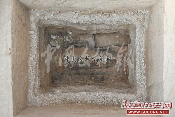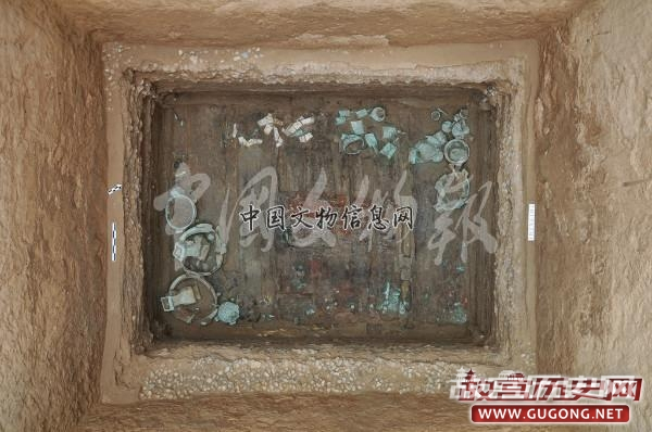 M3011在2016M1的东侧,6.4、宽5.1、深10米。墓室西北角有一盗洞,被盗扰的面积约3平方米。目前清理至椁盖板,露头的青铜器有西南角的鼎、壶,西北角盗洞处的椁盖板下有被破坏的铜鉴。