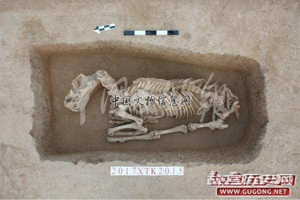2017年发掘区中部有一对东西并列的大中型对子墓M2009、M2010,西侧的M2009规模大,应是大夫一级的墓葬,推测墓主人是一名男性,东侧的M2010规模略小,墓主人自然是其夫人。M2009、M2010周边有祭祀遗存,动物祭祀坑30个,多数集中在M2010的北部,个别祭祀坑在M2009的东北部、M2010的西部、西北部,马坑分布在祭祀坑的外围。M2010的北部还有玉石器祭祀遗存,因距地表较近,部分被破坏,有玉环、石圭等,无论是数量还是质量,均与2014年M7相差甚远。另外有2座大型墓葬的周边共有近60个有动物祭祀坑,多数分布在墓口北部。