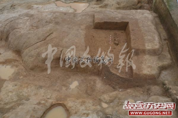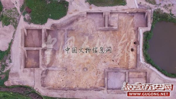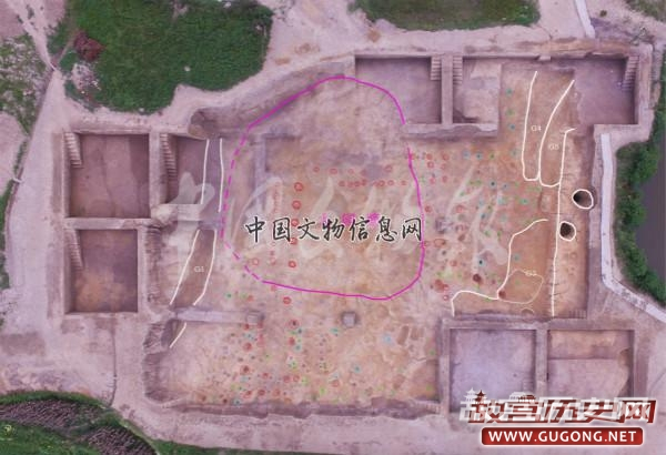 F2:为一处大型回廊式建筑基址,开口于⑥层下(局部开口于F1垫土层下),打破生土。构筑方式为先在生土面上铺垫一层较纯净的黄色黏土,在垫土表面栽桩立柱。柱洞规格在45-90厘米之间(少量柱坑尺寸达到110—150厘米),大体呈回廊式布局,中间为一主体建筑两侧为附属建筑整体构成一处大建筑群。该建筑建造考究,规模较大,推测可能为一处礼仪性建筑。受发掘面积所限,该建筑群尚未完整揭露。