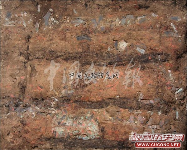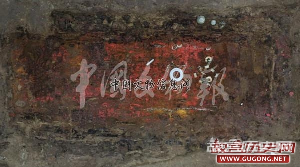 部分墓葬池下串饰物组合保存相对较好。以墓葬M40为例,由石磬形饰、陶珠、费昂斯珠、石贝、铜铃、铜鱼组成。石磬形饰、石贝两两成组,陶珠或夹杂个别费昂斯珠以四个呈一线排列。悬挂排列上石磬形饰组单独式悬挂;陶珠(夹杂个别费昂斯珠)组置顶端,末端衔接一对石贝组的复合式珠贝组合。铜鱼两两成组,各组内两铜鱼形制各异,鱼尾夹角呈尖角或弧角,大小不一,头朝上,每间隔一段小距离悬挂。铜铃内外两道各悬挂1件,每间隔一段大距离出现。木棺之下发现有棺架遗存,如早年被毁的墓葬M257椁室扰土下发现近一米厚的淤土层,土色发黄,质密较纯净,未发现任何遗迹现象及遗物。淤土层下见椁室底板,东西向平铺。椁室东西两侧近底部发现几根南北向木板,叠压于椁室底板之上。其中东侧1根木板南端基本保留原始位置,置于较高处。初步推测,残留南北向木板,是承托木棺之用,类似于棺架。木棺虽破坏殆尽,形制规格不清,但从出土位置来看,距离椁室底板有近1米,这个高度仅有类似棺架遗存方能托起。