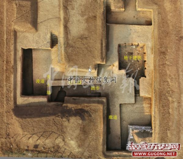 考古队清理确定,三号建筑夯土台基西部设一东西宽4.8、南北长5.6、深约0.9-1.1米的地下建筑,向南经一东西宽0.9、南北长约3.3米过道与台基外联通。三号建筑通过宽约3.3米廊道向南与二号建筑连接,廊道北端西侧设空心砖踏步,空心砖南北长1.38、东西宽0.36、露出地表0.16米。