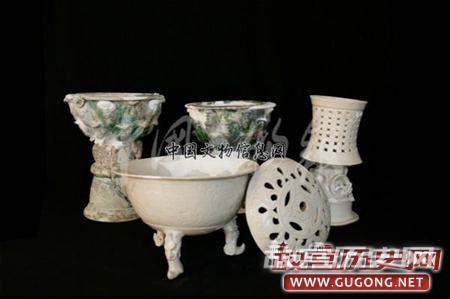 宗教遗物 开元寺南广场遗址出土了跨越北朝到宋金元各代的宗教遗物。北朝到唐五代时期的宗教遗物包括精致的汉白玉造像残件、铜佛像、瓷质造像等,制作精美,规格较高。宋金元时期的宗教遗物主要发现于 F5、F11 两座庙宇内。F5 内出土了百余件器物,其中包括白釉刻划花镂孔盖三螭足熏炉、白釉镂孔蟠龙座熏炉、绿釉贴塑蟠龙莲花形熏炉、红陶莲化生童子塑像以及裸体泥俑等遗物。F11 内则出土了一批白灰塑像残块。此外在宋金元时期的文化层和民居房址内还发现有泥质红陶造像、瓷塑像、瓷质和陶质的熏炉及香炉等宗教遗物。在明清时期文化层中发现了一件泥质红陶牌饰,上面的图案具有祆教特征。