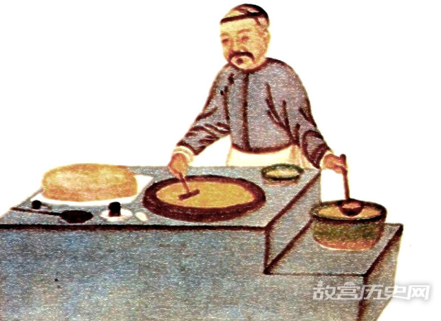考古在河南登封高村宋代墓葬发现的壁画中,见到了一幅《厨娘烙饼图》,画面上有三位执事厨娘,一位在擀面,一位用铛在烙饼,一位端起烙好的饼要离开。由饼铛的样子看,应当是平面无沿的,只是这饼要先擀后烙,与煎饼工艺稍有不同。