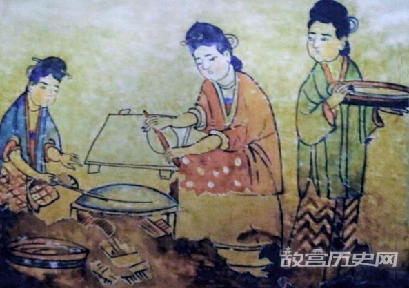在甘肃嘉峪关发现一批魏晋时代墓葬,出土大量彩绘砖画,很多画面都表现了当时的厨事活动,其中就有两幅摊煎饼的图像,其中一位厨娘双手举起煎饼,好像觉得煎得不错呢。