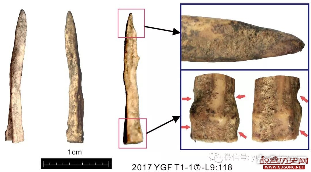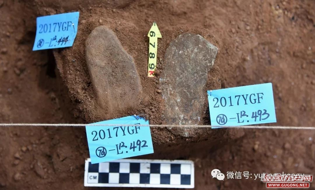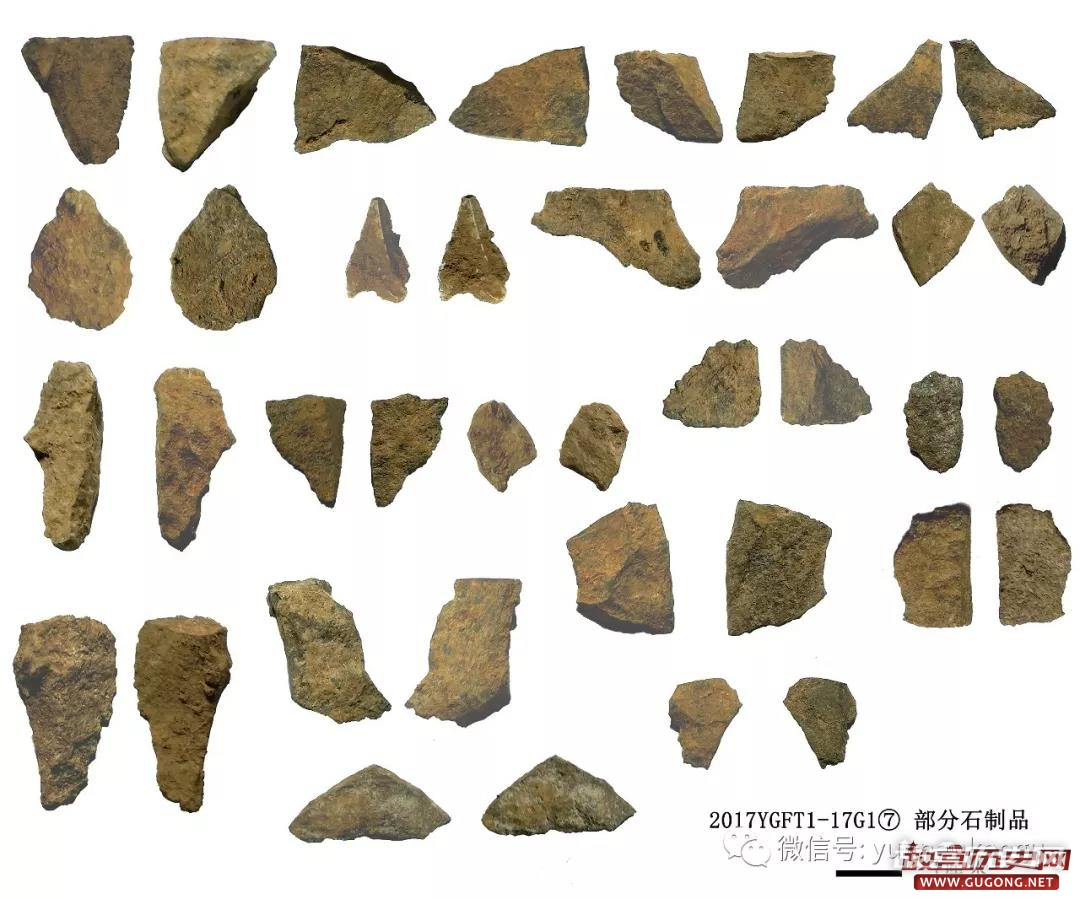 目前,编号器物已达1644件。从标本类型上包括石制品752件、砾石3件、烧石11件(大部分出自HD1)、蚌壳396件、烧蚌5件、动物骨骼434件、骨角器4件、陶片2件、植物种子1件。其中石制品中包括石核20余件、石锤1件、石器50余件、石片200余件。从地层分布上,第⑥层又编号标本18件、第⑦层923件、第⑧层386件、第⑨层234件、用火遗迹HD1发现83件。另外,在筛选出的收集品和浮选出的重和轻浮物中还发现了大量尺寸细小的遗物和植物种子等,其具体数量目前还未完全统计。主要从2017YGFT1-1局部统计推测的初步估计,T1目前已发现遗物数万件。