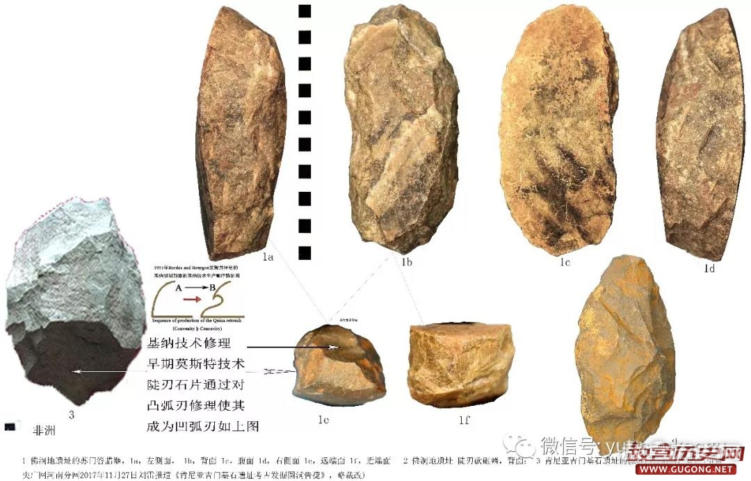 遗址出土的基纳技术修理的陡刃砍砸器和苏门答腊器与左边非洲桑戈后重工业的单背向扁平砾石石核一致
