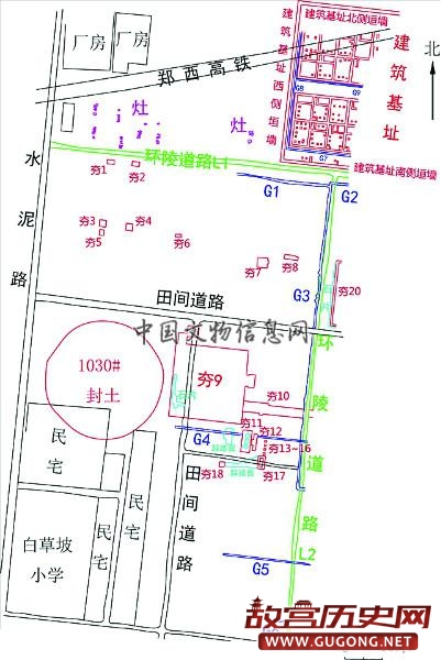 目前的发掘工作主要针对封土北侧的夯土建筑、道路和灶坑等遗迹,内陵园北侧道路宽约7.4米。在道路南侧,封土正北方向发现一组东西对称的夯土台基,东西长8米,南北宽4.5米。两座夯土台基之间的间距为20米,有可能是陵园的阙台遗迹。