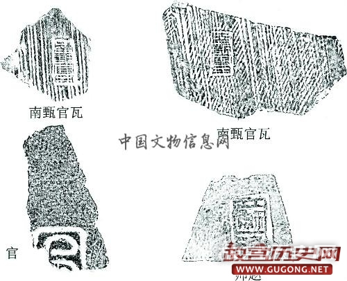 出土遗物 主要有绳纹筒、板瓦,卷云纹瓦当,空心砖、方砖、条形砖等建筑材料,其中筒瓦、板瓦有戳印“南甄官瓦”;日用陶器有盆、罐、碗等,以及各种铁质兵器,如戟、蒺藜、镞等。