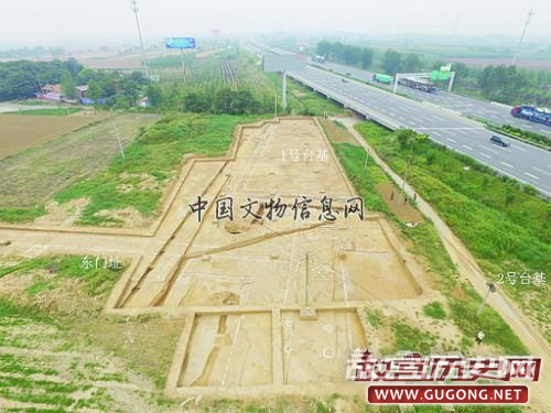 1号台基建筑单元 建筑单元整体布局略呈方形,南部为夯土台基,台基北侧外围一周为廊道,中间区域为天井。建筑单元东西隔墙间距60.9米、北隔墙至台基南缘散水约59.9米。夯土台基平面呈长方形,东西长48米、南北宽31.7米。台基南缘东、西对称分布有两处通道,西侧漫道、东侧阶道。台基西缘偏南有一阶道,空心砖踏步。台基北侧、东侧廊道外沿发现有排水设施。