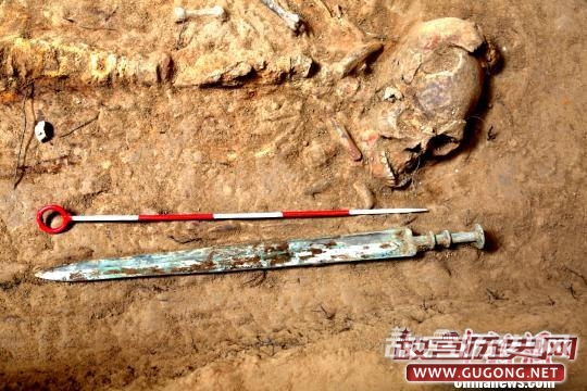 考古人员在一座秦人墓葬中发掘出土了保存完整的铜剑一柄,通长60厘米。属于传统的“周式”长剑,一体连铸,束腰及八面体的剑身有很强的杀伤力。