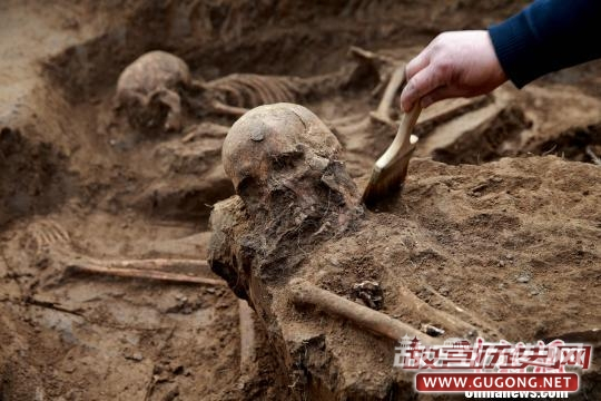 图为遗址中发现的祭祀坑,考古人员正在用毛刷对人骨进行处理。 梁犇 摄
