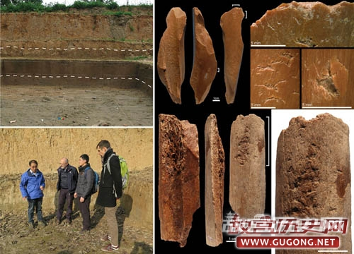 图1:左上展示许昌人遗址发掘场景;左下是研究者于2016年冬考察许昌人遗址照片(从左至右:李占扬,Francesco d’Errico,李浩,Luc Doyon);右侧展示2件发现于许昌人遗址的骨质软锤工具,其中右上的1件采用新鲜动物长骨,疤痕稀疏,使用程度低;右下的1件采用风化动物长骨,疤痕集中,使用程度高(Luc Doyon供图)