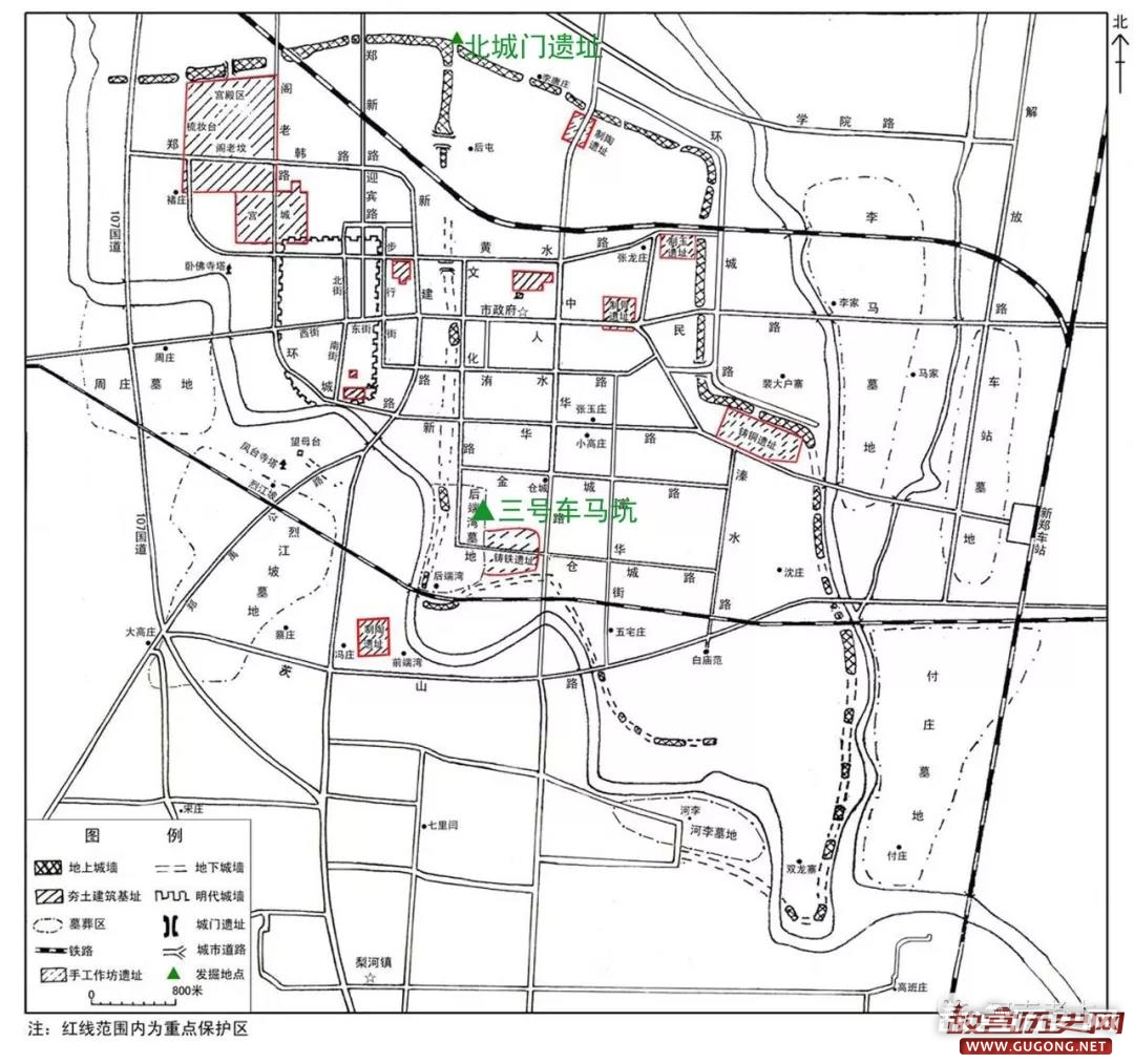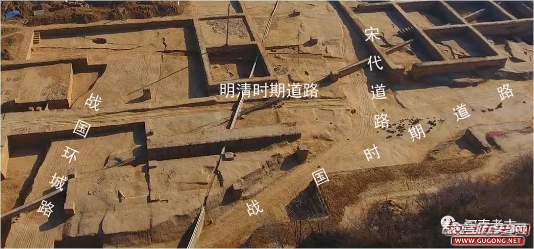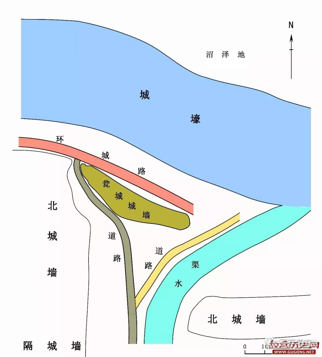北城门遗址位于文化路北端,在隔城墙与北城墙交汇处,目前已布10米×10米探方68个,发掘面积7000余平方米。发掘期间共清理出春秋战国至明清时期带车辙的道路16条,春秋时期水渠1条,战国时期瓮城城墙1处,不同时期的灰坑、水井、墓葬等共计45座,还有战国时期排水管道、活动硬面、踩踏面、瓦砾层等重要遗迹。