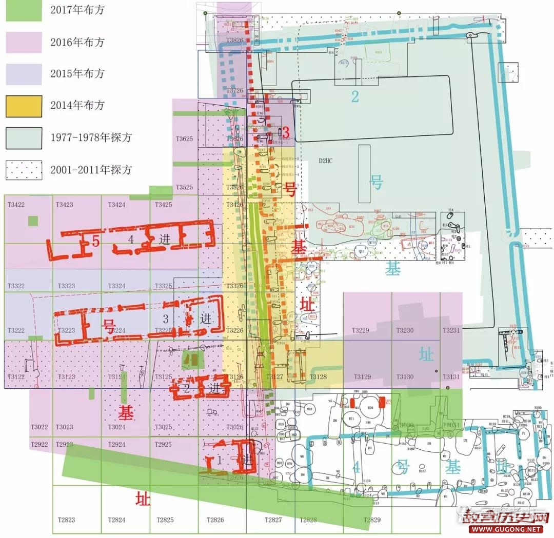 2001~2002年,中国社会科学院考古研究所二里头工作队在二里头遗址宫殿区东中部发现东西并列的3号和5号基址,二者中间以通道和暗渠间隔。3号基址由至少3进院落院组成,院内发现2排5座贵族墓葬,出土包括绿松石龙形器在内的较多精美文物。为全面、深入了解二里头文化早期大型夯土基址的形制、结构、年代变迁,以及相近区域的遗存分布情况和时代性变化、宫室营建制度等课题, 2010~2011、2014~2017年又对5号基址进行了多次发掘,基本厘清5号基址的平面布局、结构、年代变迁等问题。