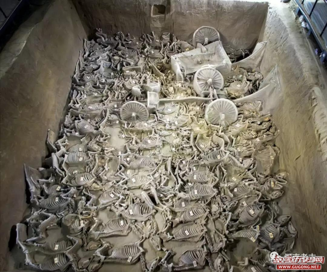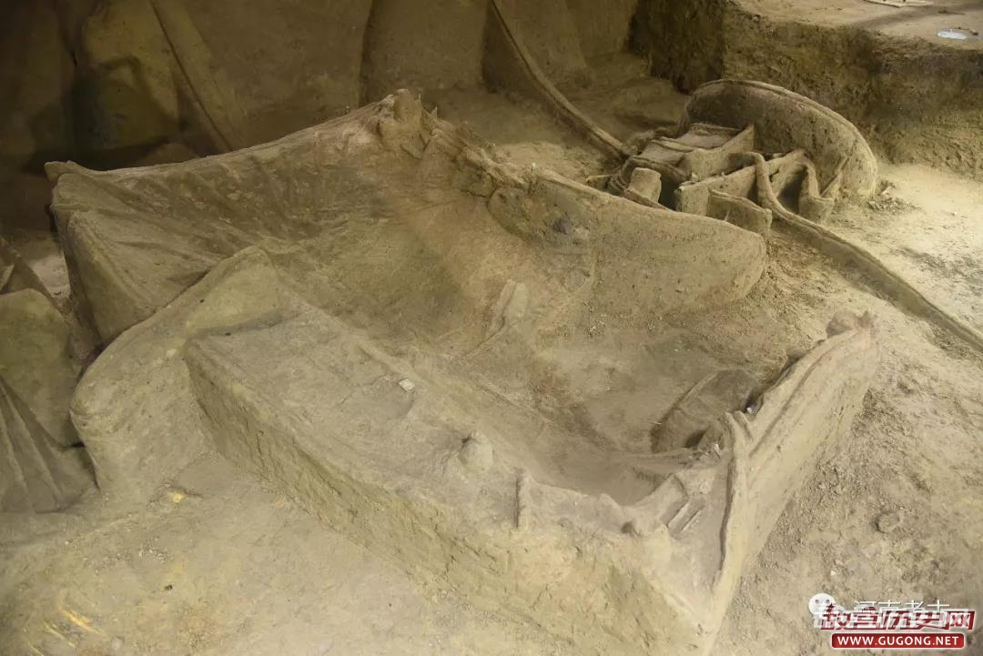 沿着隔城墙向南,郑公一号大墓的陪葬坑三号车马坑。该坑呈南北向近长方形竖穴土坑状,口大底小。坑口南北最长11.7米,东西最宽10.6米,深5.9米。上层厚约3米的填土为夯土,下层为多层从四周向中间倾斜的淤土层,淤土层富含陶片、炭粒、兽骨和少量红烧土块。坑底清出至少124匹平铺的马骨,马骨几乎全呈头向西足向南的侧躺式摆放,东西向5列,南部坑边和东南角马骨叠压2到3层。其中1号大型安车为舆长约2.2米且饰有青铜和骨器构件的彩席顶棚。郑公大墓陪葬各种车辆48辆以上,马124匹以上,出土的车辆和马骨之多,在我国东周考古发现中名列前茅,为研究周代车马葬制、葬俗、马匹特征等提供了重要材料,也为北城门遗址清理的带车辙的道路遗迹提供了相互的印证。二者相互结合,为“车辚辚马萧萧”的东周列国时代添上浓烈的一抹重彩。