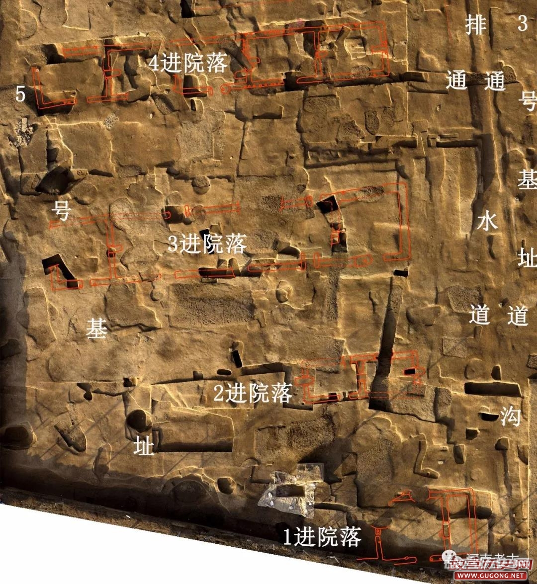 首先,明确了5号基址的布局和构成。台基最上层夯土总面积超过2700平方米,坐北朝南,方向约为南偏东4.5度,由至少4进院落组成。每进院落包括主殿、院内路土,第2~4进院落内共发现3排5座同期的贵族墓葬。各进院落的主殿均为以窄墙间隔成不同房间的连间排房,南侧多有门道,部分主殿北侧有门道。多数南北向墙体中间有缺口,缺口中间有东西向窄墙,东西向窄墙与南北向隔墙垂直但不相连。