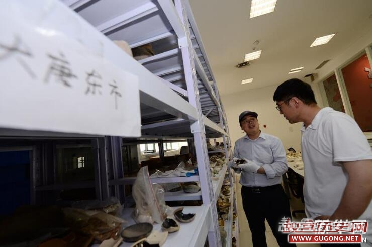 5月15日,中国社会科学院考古研究所西安唐城考古队负责人李春林(左)和队员王子奇查看西安隋唐长安城东市遗址出土的遗物。新华社记者 李一博 摄