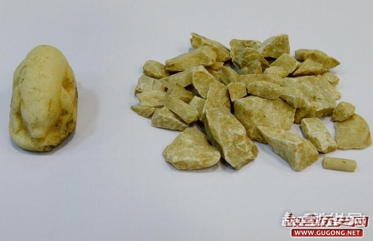 这是西安隋唐长安城东市遗址出土的白玉熊(左)和汉白玉石料(5月15日摄)。新华社记者 李一博 摄