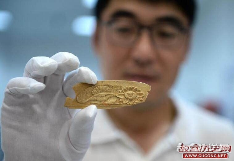 5月15日,考古工作者展示西安隋唐长安城东市遗址出土的莲花纹骨梳柄。新华社记者 李一博 摄