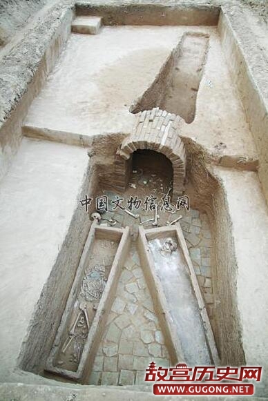 封门砖用条砖垒砌为“人”字形封堵,上部早年已被盗墓者拆除。甬道为砖券。墓顶已被破坏,墓室长296厘米、宽178~202厘米、残高98厘米,距地面深170厘米。墓室地面散乱铺有碎砖。墓室内南北放置两具木棺,头档朝外,为夫妻合葬墓。由于盗掘,棺内人骨不全,大部分被扔在棺外。