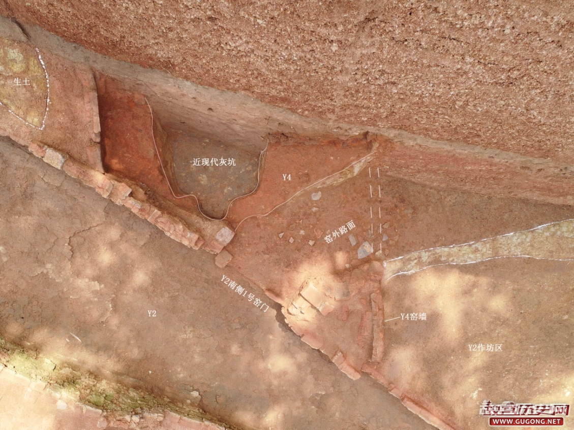 Y4为半地穴式长斜坡龙窑,窑床前端被清代缸窑Y2及窑门外道路打破,窑床中部被近现代灰坑打破,后部未发掘,保存情况不详,已揭露长度约2.5米,宽2.7米,坡度约15度(图七)。