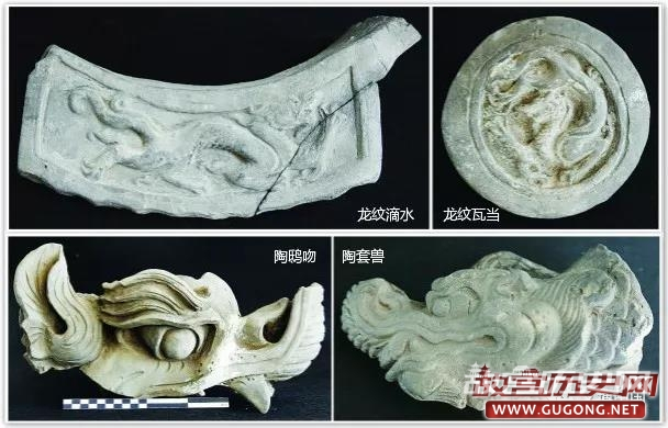 本年度发掘,出土遗物以灰瓦、青砖等建筑构件为大宗。灰瓦有板瓦和筒瓦、滴水及瓦当。瓦当纹饰主要为龙纹、兽面纹和花卉纹;其他有套兽头、螭首、鸱吻、人物塑像等残件。