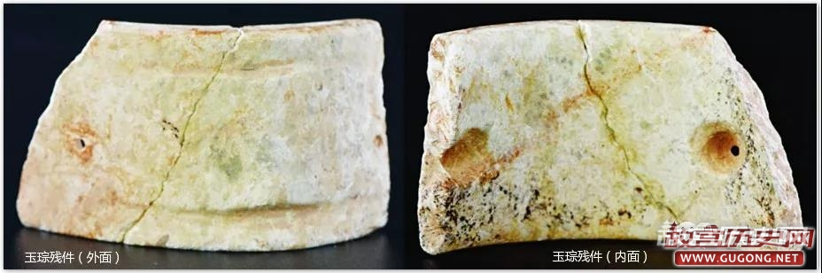随葬石器和玉器的墓葬所占比例不高,此类墓葬规模一般相对较大,伴出的陶器或陶片数量也较多,说明不同墓葬间存在等级差别。石器种类有双肩石锛、穿孔石铲和石钺、镞等,长条形的穿孔石铲磨制精美,看不出使用痕迹,估计是作为礼器来使用。墓葬中出土的玉器有装饰类的玉环、玦和工具类的小型锛等。难得可贵的是发现1件玉琮残件,在施工清表后的地表层中出土,器型小,高仅3.3厘米,圆角方形,壁较薄,厚仅0.5~0.6厘米。残器两端各有一钻孔,是由内向外的单面钻。由于磨损比较严重,已无法判断玉琮表面是否有线刻图案。无论从材质和造型看,都与良渚文化同类器非常相似,只是更像“山寨版”而已。结合典型陶器的特征来说,良渚文化的余晖通过粤北石峡文化影响到珠江三角洲腹地的广州是证据确凿的。