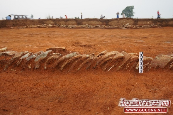 发掘区域位于公路建设区域影响的北城墙及东城墙附近和城址西南部,发掘面积3000平方米。分别对北城墙、东城墙及其外围壕沟进行解剖清理,北城墙的构筑方式:首先利用原生山体,稍加修整,再于山体上面逐渐堆筑加高,形成墙体。其堆筑方向顺山势由北向南,均呈斜向堆积,墙体堆积由上至下可分为17层,未发现夯筑痕迹。原生山体高5.72、宽27.93米。北墙体最宽15.54、高2.33米。墙体外侧有防御性壕沟,口大于底,沟壁呈斜壁内收,沟底为平底。沟口宽4.3、沟底宽2.9、深1.6米。