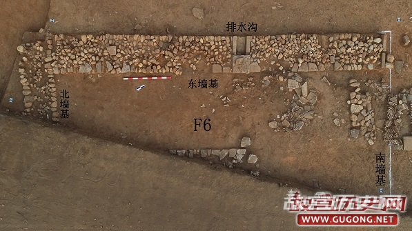 6号房址为地面起建,南北向建筑。仅发掘房址东侧部分区域。6号房址平面形状为长方形,揭露北、南、东三面墙基,东墙基中部偏南有砖砌排水沟。石墙基由1~3层卵石堆砌而成。墙基残宽0.7~0.8、残高0.15~0.25米。因其西侧未进一步发掘,故6号房址的大小尚无法判断。