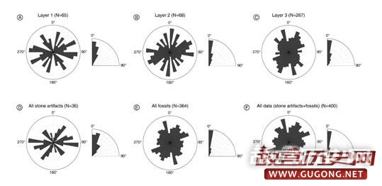 图4:遗址出土遗物的产状信息玫瑰图,圆形指示长轴方向,1/4圆指示倾角(李浩供图)