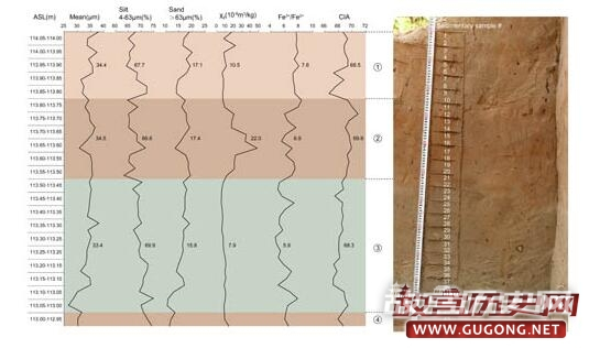 图3:遗址沉积物粒度(从左至右为平均粒径、粉砂、砂)、磁化率、Fe3+/ Fe2+及CIA指标随深度变化情况,曲线旁数字代表每一沉积阶段该指标的平均值(李浩供图)
