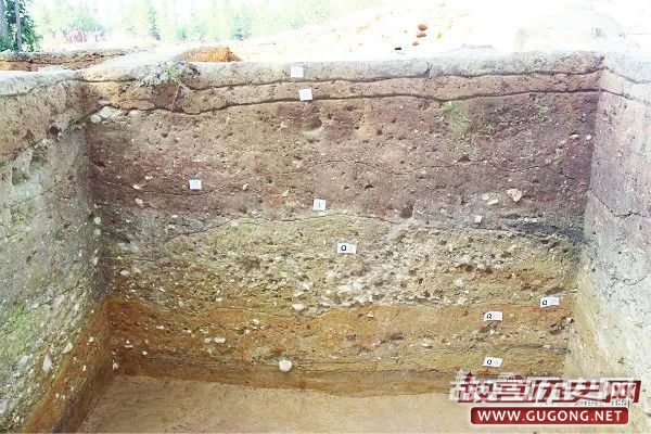 城墙 位于台地外侧,开口于4层下,外陡内缓。城墙堆积高约3.6米,共分17层,1~16层朝内呈斜坡堆积,第17层为城墙垫土层。各层堆积比较纯净,偶有零星陶片出土,人工堆筑方式明显。从地层叠压关系及城墙夹杂的遗物可判断其始建年代应为新石器时代晚期。