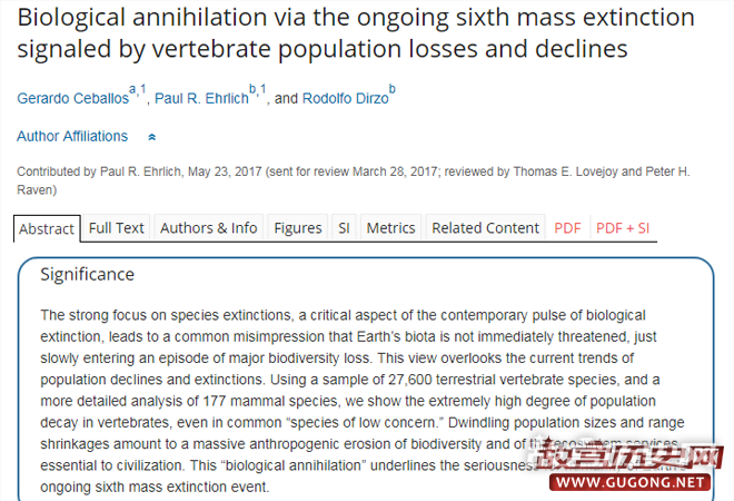 近日,《美国国家科学院院刊》发表文章,称地球正在经历“第六次大灭绝”。研究人员在分析数万种脊椎动物和哺乳类动物的数据后,发现约50%的物种灭绝,发生在近几十年内。过去一个世纪里,物种的灭绝速度,是人类出现前自然状态的百倍左右。