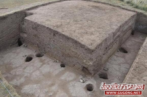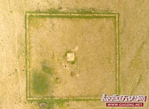 考察发现,这座大型祭祀性建筑台基遗迹系用特殊的红土夯筑而成,建筑结构为向上略有收分的二层方台,四棱体形状。下层边长35.8米,上层边长23.5米,通高2.75米。建筑台基顶部平整光滑,有人类频繁活动的踩踏面,在踩踏面上发现一具摆放整齐的羊头、羊肢骨和匈奴时期陶器碎片。另外,在台体周围共发现有36个大型圆形柱洞,开口直径最大1.05米,深达1米左右。