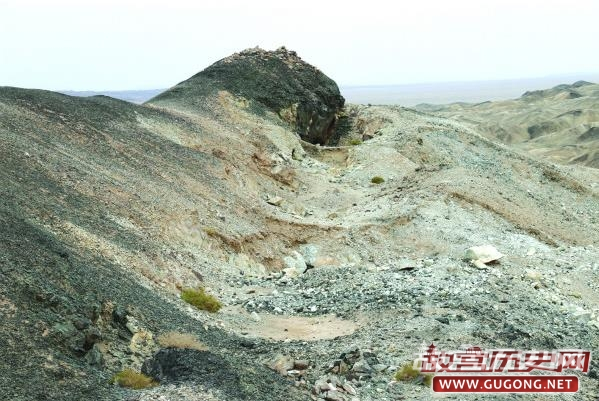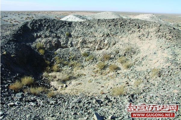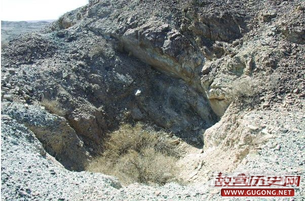 敦煌旱峡玉矿遗址 位于敦煌市东三危山后山的东南部,面积约300万平方米。共发现地面遗迹145处,其中矿坑114处、矿沟8条、岗哨12处、房址8座、选料区3处。本次调查确认玉矿矿脉三条,基本顺山体走向呈东西向分布。各类遗迹沿矿脉走向分布于山体南北两侧。矿坑均为露天开采,多为古代遗存,部分为现代开采,少量现代矿坑、矿沟系在古矿坑基础上开采形成。地表遗物有玉料、石器和陶片、铁器碎块等。陶片采集标本主要有器口、耳、腹、底、盖,以夹砂灰陶和红褐陶为主,素面居多,部分饰戳印纹、斜绳纹、刻划纹,均为手制。