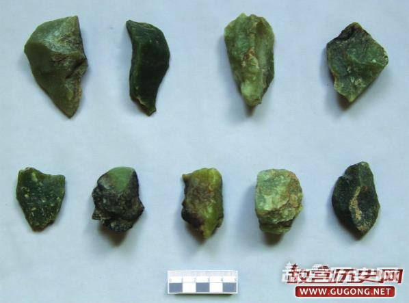 根据野外观察和室内的比较,马鬃山玉矿遗址(群)玉料和新疆、甚至辽宁河磨玉玉料颜色质感上均有很多的相似之处,但在颜色特点、透明度、副矿物组成及结构特征上又有自身显著的特点。马鬃山玉料在矿物成分及化学成分上和新疆、青海、辽宁等地的玉料基本一致,都是由高含量的透闪石组成,化学成分和标准的透闪石矿物相同。和新疆玉料相比,现在所见到的马鬃山碎落玉料多数具有风化皮壳,并且部分样品玉质与皮壳之间较难完全分开,虽然也发现了含石墨的青花料或者墨玉,但比例明显低于新疆,同时,石墨的碳同位素组成明显有不同;新疆的玉料,从新疆本地市场上出现的比例看,含石墨的样品几乎可以达到50%左右,山料一般较少含风化皮壳,子料的皮壳一般较薄;在颜色上,新疆料以青白玉和白玉为特征,虽然若羌等地也有黄玉或者黄白玉的山料,但多数不具有皮玉混杂的特点;结构上,新疆和田子料的结构一般更为细腻。和马鬃山玉矿遗址群玉料相比,青海玉料以山料为主,颜色白和青的居多,矿物颗粒较细,透明度高,含有水线的玉料较为常见。含有石墨的玉料,石墨以非常细小分布的尘状为主,比例也不大。辽宁河磨玉黄色的饱和度偏高,质地更粗,含石墨样品的比例也更大。