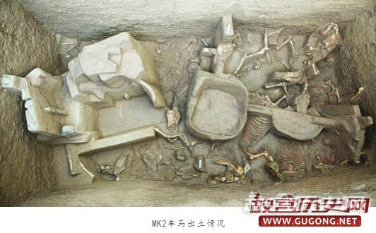 车马坑 清理1座,形制为南北向竖穴土坑。坑内殉2车,均为拆装,置于车马坑南北两端。马个体有14匹,未与车搭配作驾乘状。车马坑东北角发现1殉狗。