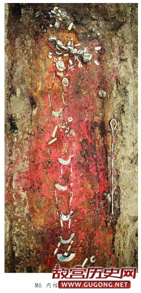 墓葬 形制均为竖穴土坑墓,开口于②层—垫土层下,打破③层—垆土层及生土。平面呈南北向长方形。有葬具者为一椁一(重)棺或重棺或单棺。椁室构建上,墓葬M6椁盖之上发现覆席现象,四周席面上每间隔一段距离发现一方形或圆形小孔,共21个,可能是为防止席子滑落所楔的木质方形铆钉。椁盖下发现围构的木质框架,围构呈“ ”字形,其中南北两横木东西两端嵌进二层台槽内,东西两竖木紧贴于南北两横木之间。可能是《既夕礼》记载之“折”。“折”下椁室东西两侧发现挖槽方形立柱,其作用是支撑“折”的。棺饰组合中新发现棺架遗存。墓葬M166内棺底板以下发现木质框架,由内、外两重南北向长方形圆木组成,内框架南北两端各搭一根东西向圆木,组成外“口”内“目”字形结构。葬式明确者,仅1座为仰身直肢葬,其余皆为屈肢葬。屈肢葬者,仅腿骨略作弯曲状,向右或向左,甚少发现蜷曲较甚者。