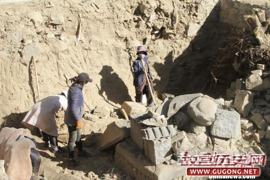 由于拉萨城区发展,原在偏僻之地的嘎尔琼拉康被林立高楼所包围。而在这座寺庙的院子里,几名工人正在围墙内挖土抛石,约50平方米的面积挖了1米多深。
